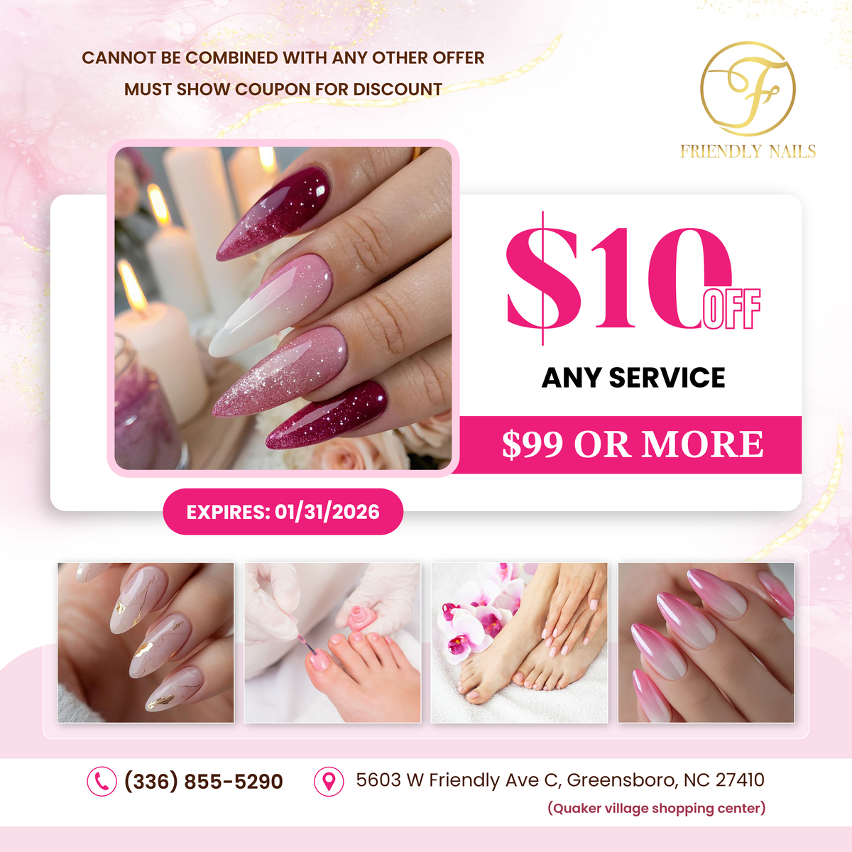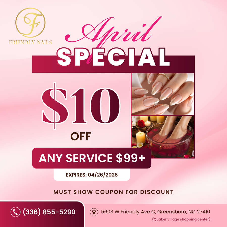 Welcome to Friendly Nails. Located at a beautiful place in Greensboro, NC 27410. Friendly Nails offers the ultimate in pampering and restoring your beauty with our whole-hearted, careful & professional staff. Comprehending customer is not an easy task. It’s even harder when it comes to nail art & caring services.
